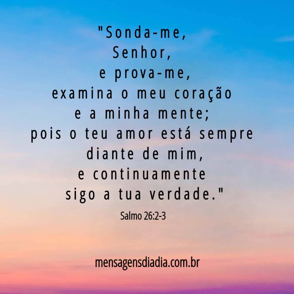 “Sonda-me, Senhor, e prova-me, examina o meu coração e a minha mente; pois o teu amor está sempre diante de mim, e continuamente sigo a tua verdade.” Salmo 23:2-3