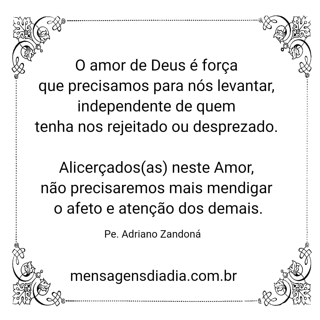 O amor de Deus é força que precisamos para nos levantar, independente de quem tenha nos rejeitado ou desprezado. Alicerçados(as) neste Amor, não precisaremos mais