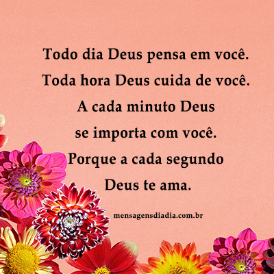 Todo dia Deus pensa em você. Toda hora Deus cuida de você. A cada minuto Deus se importa com você. Porque a cada segundo Deus