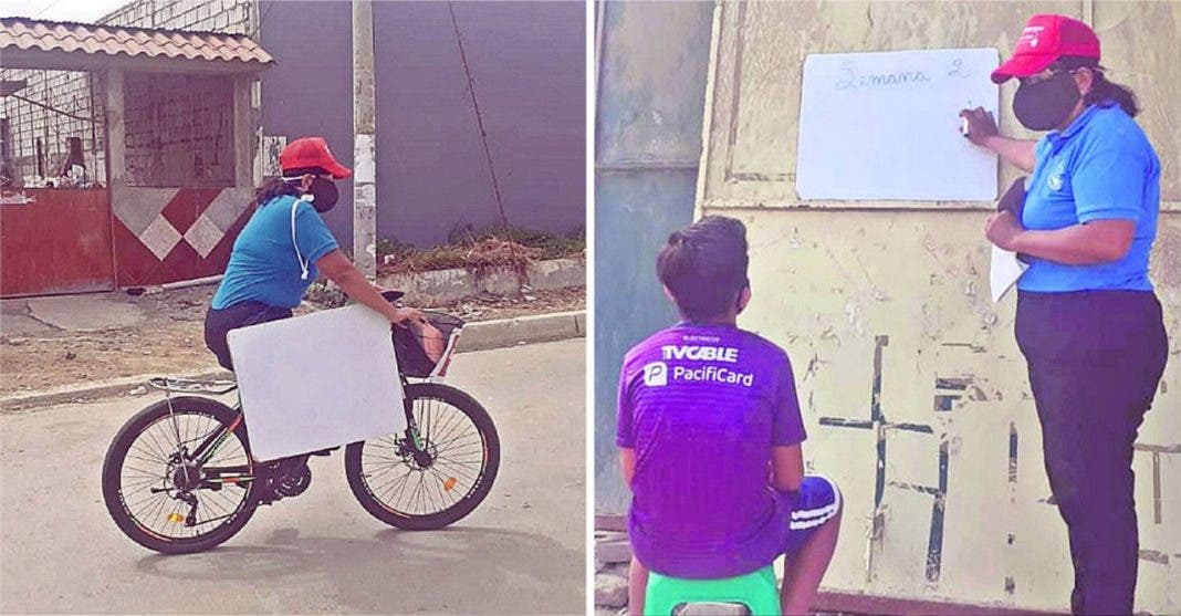 Carolina Espinoza leva até o quadro na sua bicicleta. Ela não quer que ninguém fique sem estudar: “O sorriso deles me motivou. Eles me agradecem”,