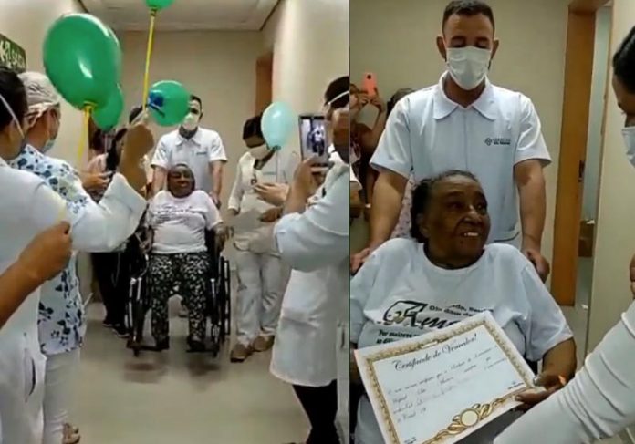Idosa que ficou 136 dias internada vence Covid e recebe duas festas