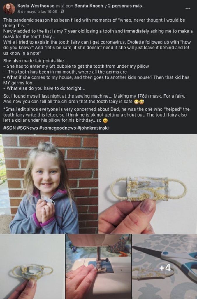 “Esta temporada de pandemia foi cheia de momentos. Acabei de adicionar à lista a minha filha de 7 anos que perdeu um dente e imediatamente me pediu para fazer uma máscara para a fada dos dentes.