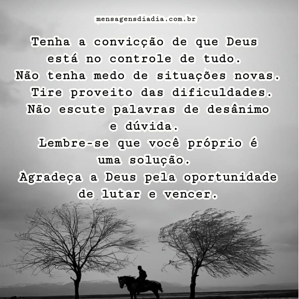 Tenha convicção de que Deus está no controle de tudo. Não tenha medo de situações novas. Tire proveito das dificuldades. Não escute palavras de desânimo e dúvida. Lembre-se que você próprio é uma solução. Agradeça a Deus pela oportunidade de lutar e vencer.