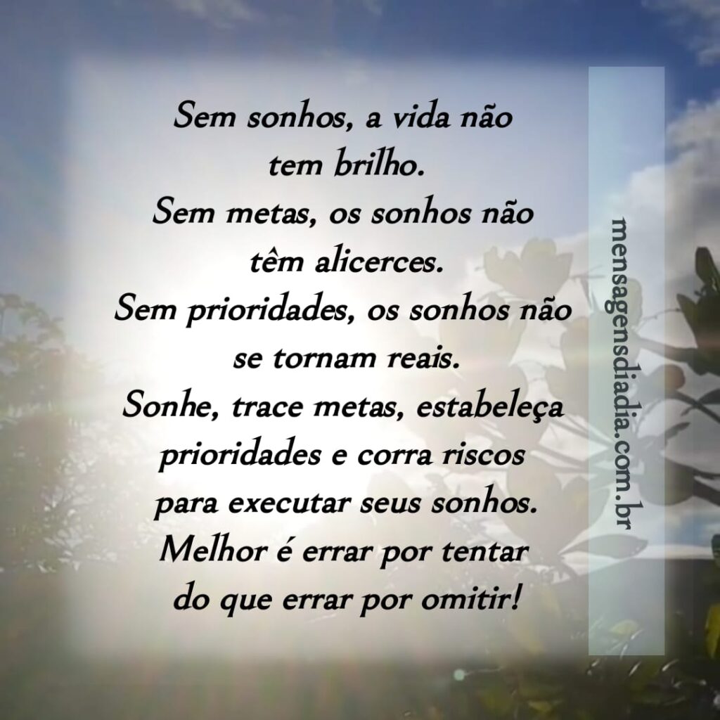 Sem sonhos, a vida não tem brilho. Sem metas, os sonhos não têm alicerces. Sem prioridades, os sonhos não se tornam reais. Sonhe, trace metas, estabeleça prioridades e corra riscos para executar seus sonhos. Melhor é errar por tentar do que errar por emitir!