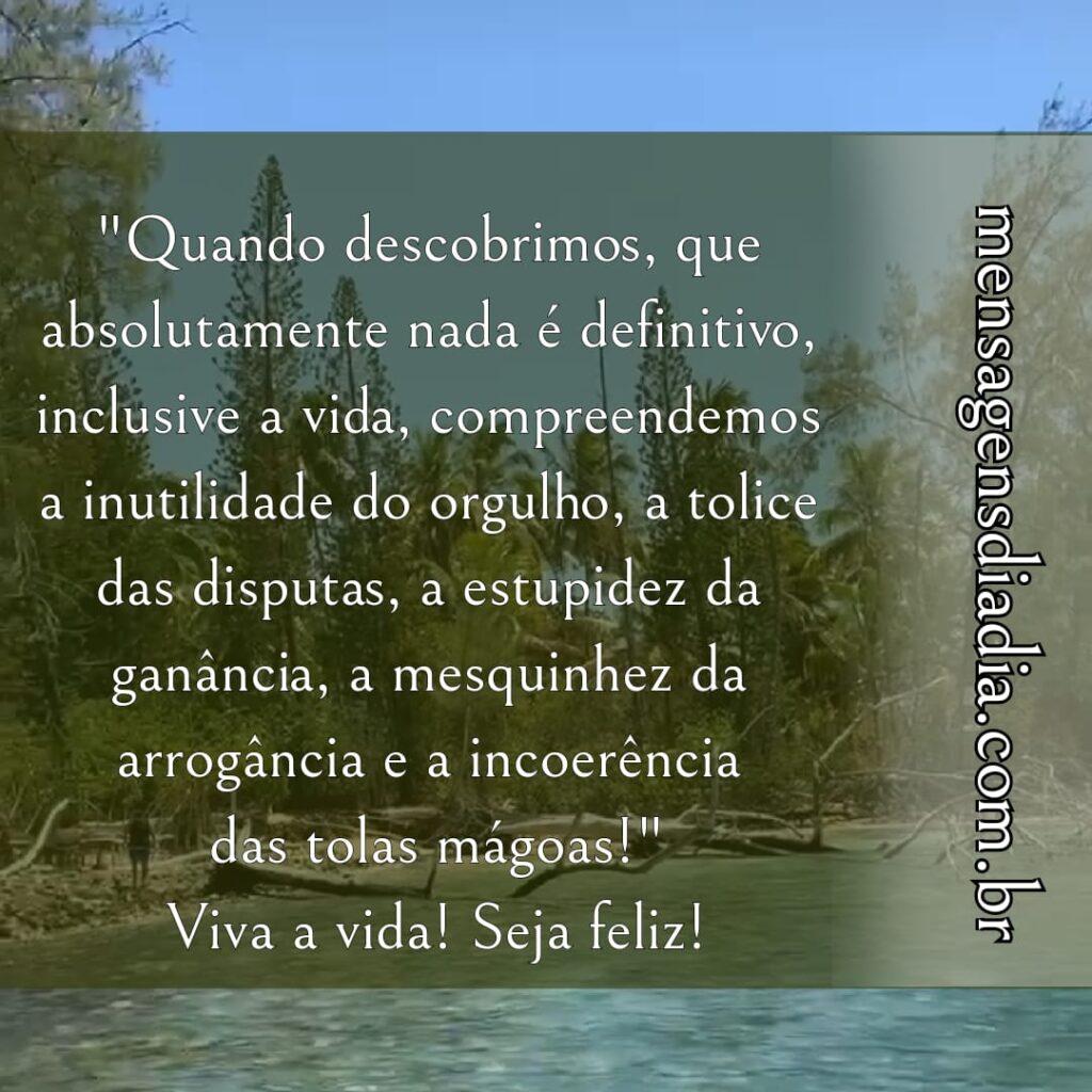 “Quando descobrimos, que absolutamente nada é definitivo, inclusive a vida, compreendemos a inutilidade do orgulho, da mesquinhez da arrogância e a incoerência das tolas mágoas!” Viva a vida! Seja feliz!