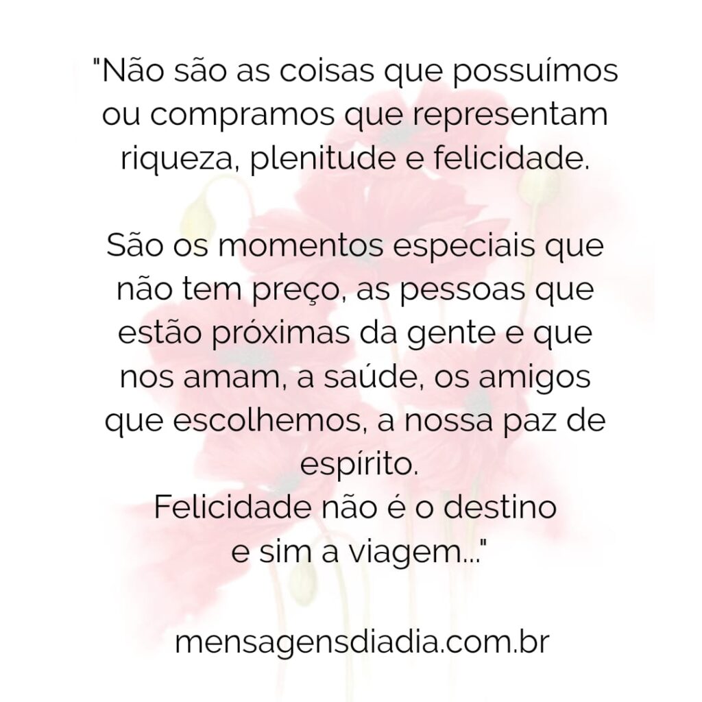 “Não são as coisas que possuímos ou compramos que representam riqueza, plenitude e felicidade. São os momentos especiais que não tem preço, as pessoas que estão próximas da gente e que nos amam, a saúde, os amigos que escolhemos, a nossa paz de espírito. Felicidade não é o destino e sim a viagem….”