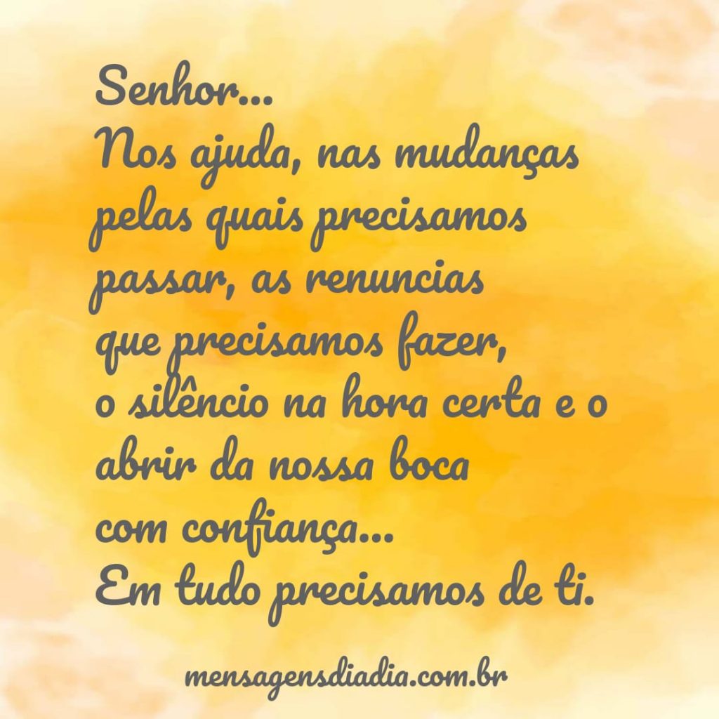 Senhor, Nos ajuda,nas mudanças pelas quais precisamos passar, as renuncias que precisamos fazer, o silêncio na hora certa e o abrir da nossa baca com confiança….Em tudo precisamos de ti.