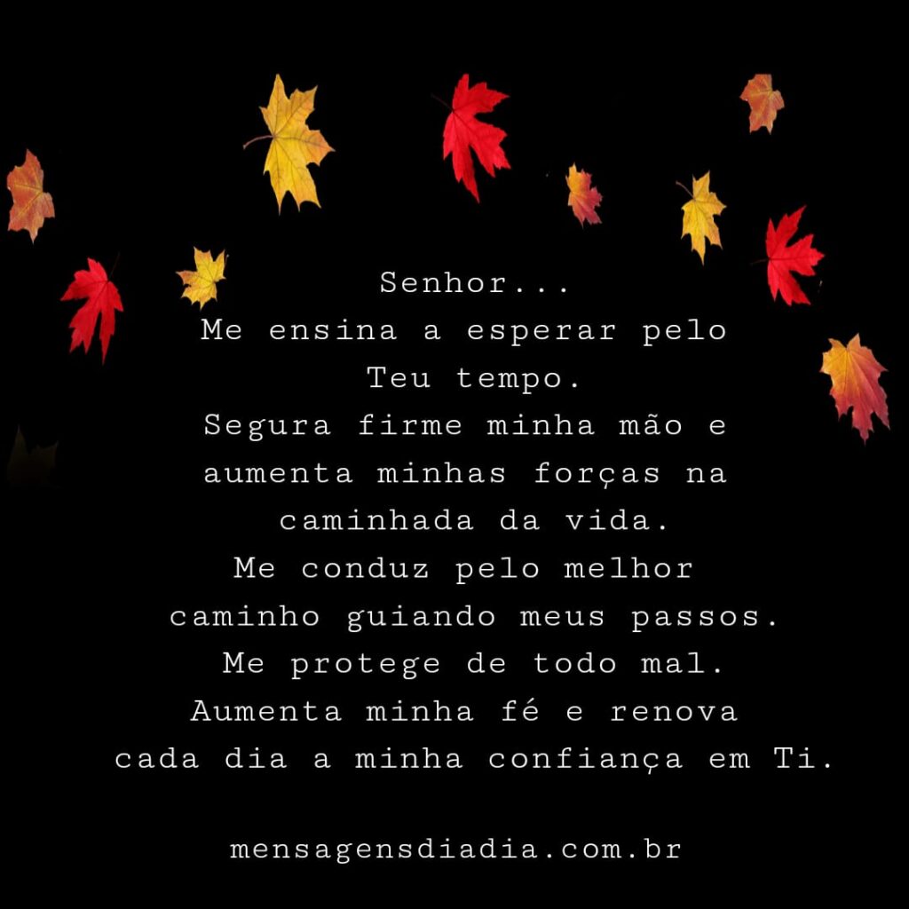 Senhor me ensina a esperar pelo Teu tempo. Segura firme minha mão e aumenta minhas forças na caminhada da vida. Me conduz pelo melhor caminho guiando meus passos. Me protege de todo mal. Aumenta minha fé e renova cada dia a minha confiança em Ti.