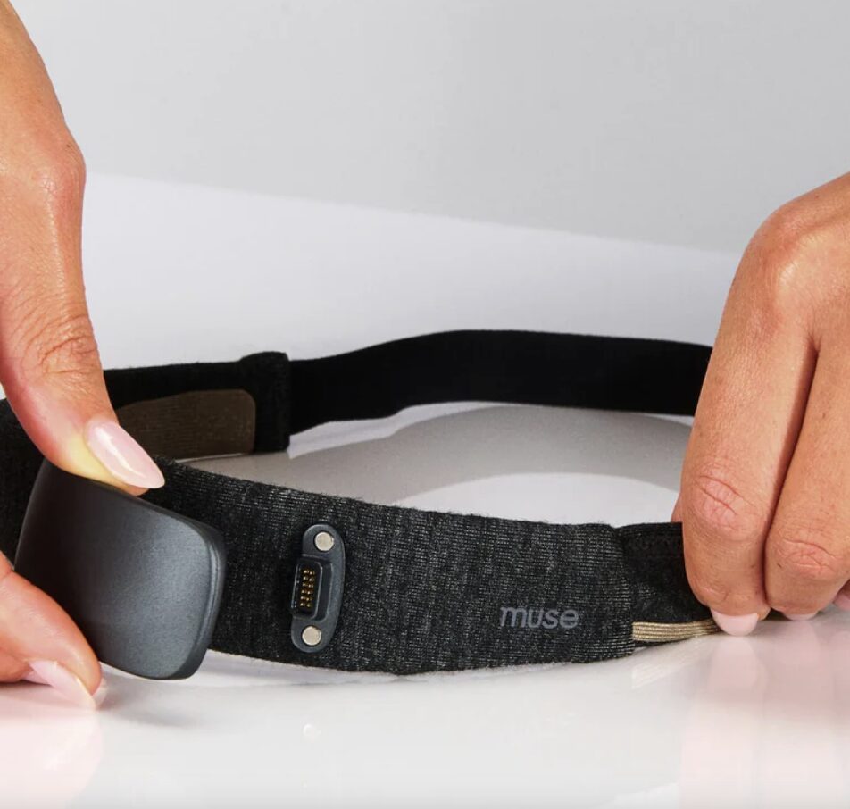O Muse é uma faixa com sensores que mede sinais fisiológicos e cerebrais e entrega biofeedback em tempo real (via áudio/app). A marca descreve que mede atividade cerebral, além de frequência cardíaca, respiração e movimento, com sessões guiadas para treinar foco e calma.